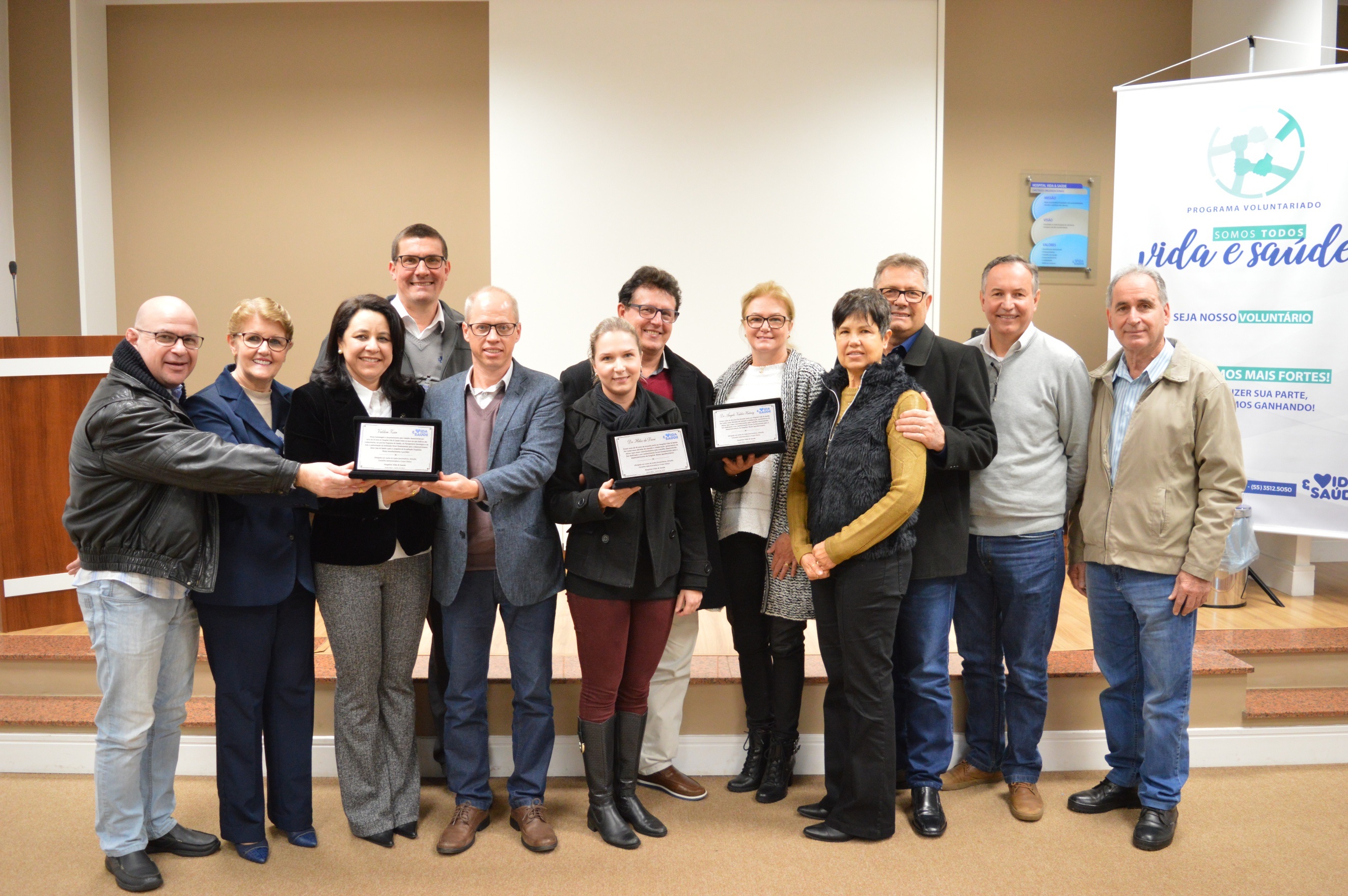 No Dia da Gratidão, o Consultor Valderi Zir que atuou por cerca de 10 anos prestando consultoria para implantação do Programa de Gestão e para toda a padronização das atividades e Planejamento Estratégico do Vida & Saúde foi homenageado, na quarta-feira. Assim como ele, o Dr. Ângelo Hatwig e o Dr. Hélio de Davi do Laboratório Adolpho Lutz também receberam homenagem pelos mais de 40 anos de atuação junto do hospital. Os três profissionais receberam placas em forma de agradecimento por todo o trabalho desenvolvido. No dia 27, quinta-feira, a direção esteve reunida com as lideranças do hospital para comemorar os 84 anos, e também, para reforçar diretrizes da Instituição. Segundo a Diretora Geral Vanderli de Barros, “Nosso hospital tem um grande diferencial que é o que nos faz passar por dificuldades, crescer juntos, vencer e cada vez melhorar ainda mais nossos atendimentos, que são as pessoas que aqui atuam. Nossos profissionais são o coração dessa Instituição e fazem toda a diferença no nosso dia a dia, só podemos agradecer todos que se dedicam em prol de uma Instituição cada vez melhor”.